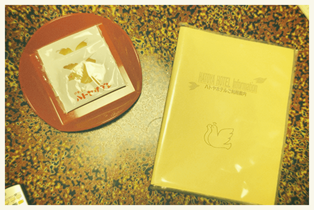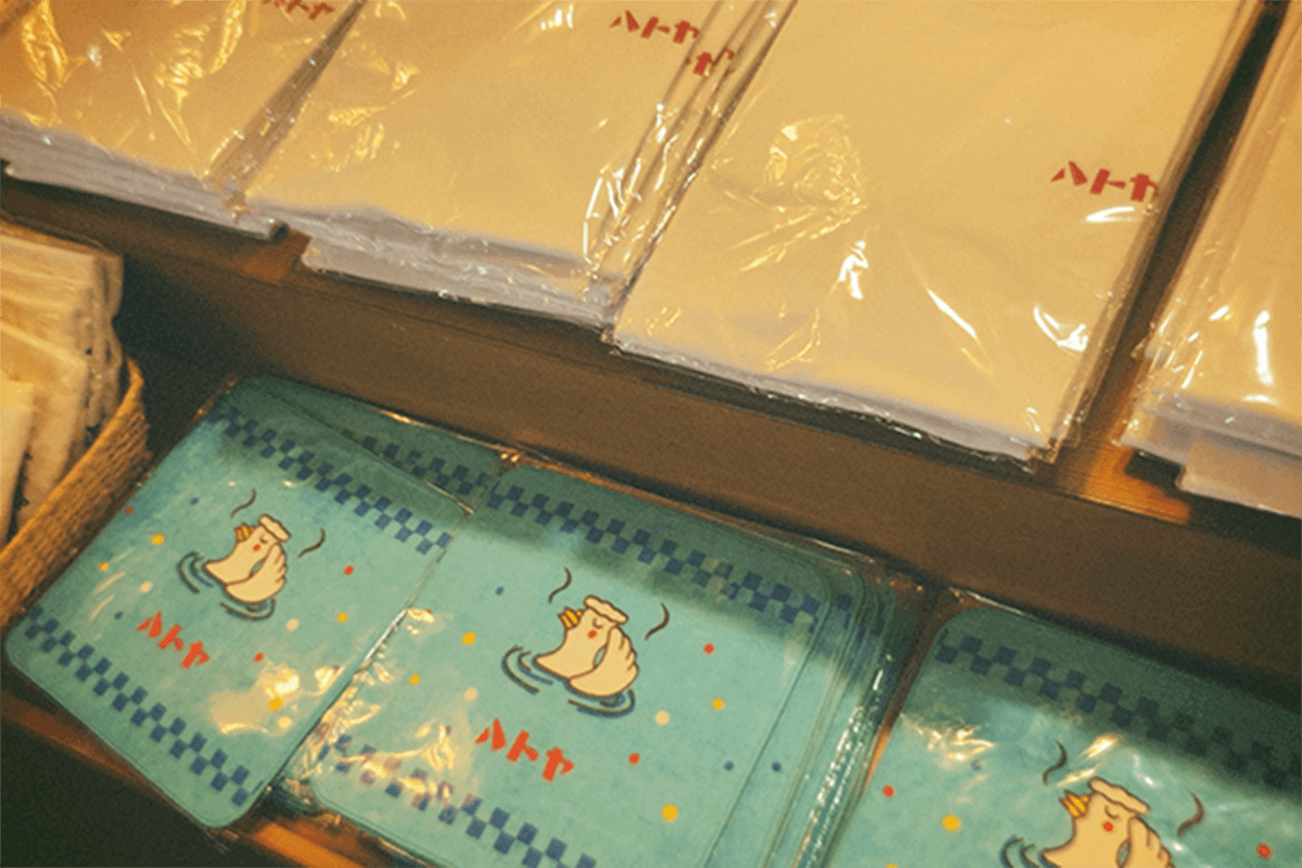 お土産コーナー。ハトヤグッズがいっぱい。